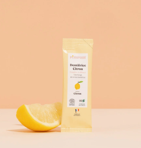 Un sachet de dentifrice en poudre à diluer directement dans le flacon en verre prévu à cet effet.
